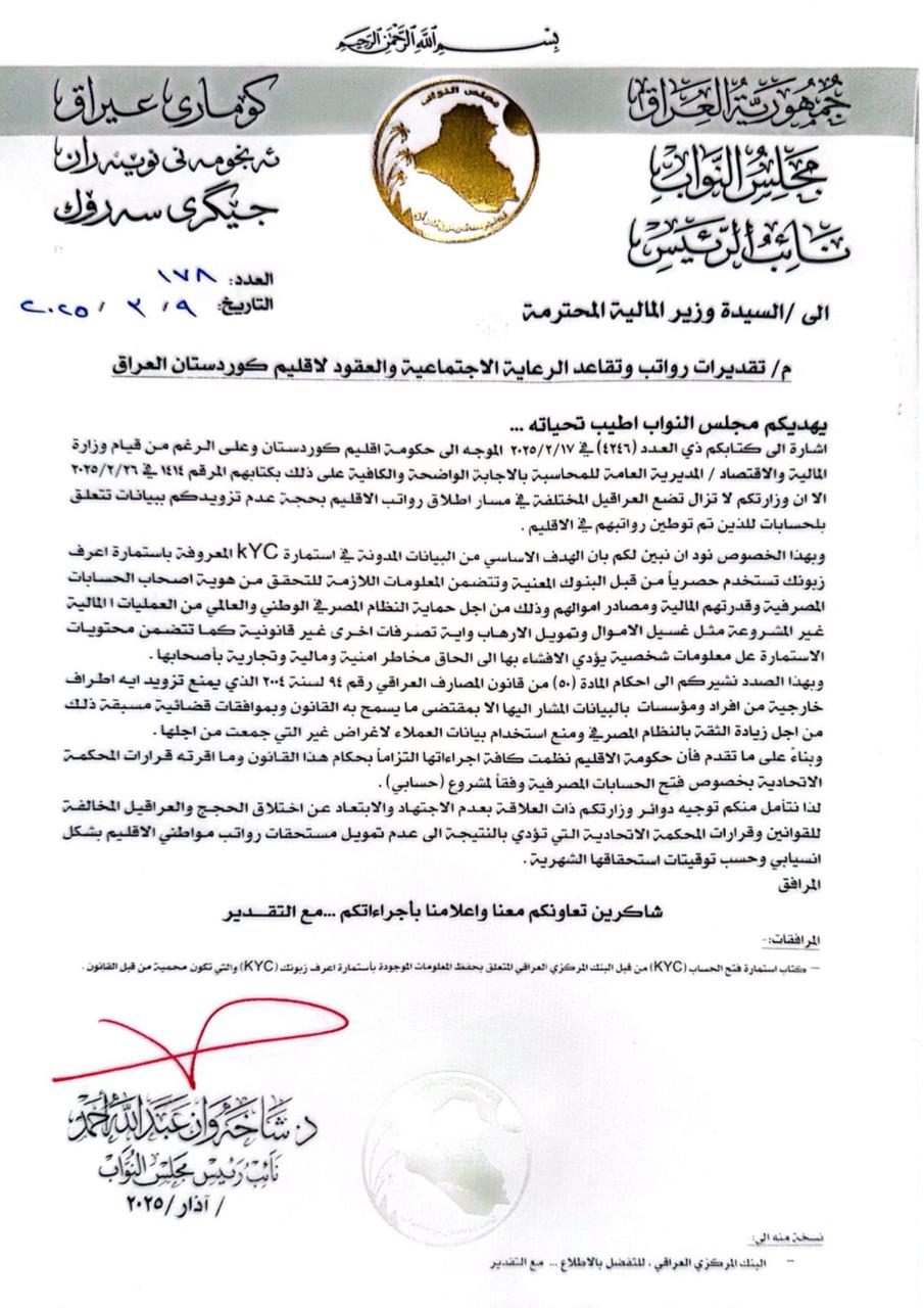وجه نائب رئيس مجلس النواب العراقي شاخوان عبدالله، اليوم الاثنين 10 آذار 2025، كتاباَ لوزير المالية الاتحادية، دعا خلاله إلى إلى توجيه المؤسسات ذات العلاقة، بعد الاجتهاد عن اختلاق الحجج والعراقيل المخالفة للقوانين، وقرارات المحكمة الاتحادية التي تؤدي بالنتيجة إلى عدم تمويل مستحقات رواتب الإقليم بشكل انسيابي وحسب توقيتات استحقاقها الشهري.