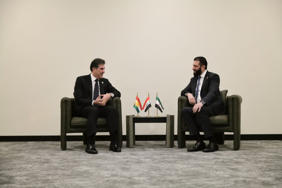 اجتمع نيجيرفان بارزاني، رئيس إقليم كوردستان، ليلة (الجمعة، 11 نيسان 2025)، في إطار مشاركته في منتدى أنطاليا الدبلوماسي بتركيا، مع \ أحمد الشرع، رئيس الجمهورية السورية.