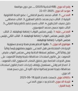 وذكرت المحكمة في بيان رسمي نُشر على موقعها الإلكتروني ، أن الدعوى الاولى سُجلت ضد رئيس مجلس النواب العراقي ونوابه، وتضمنت المطالبة بعدم دستورية إجراءات تمرير القرار والتصويت عليه، بالإضافة إلى طلب إصدار أمر ولائي بإيقاف تنفيذ القرار، إلا أن المحكمة قررت رفض الدعوة.