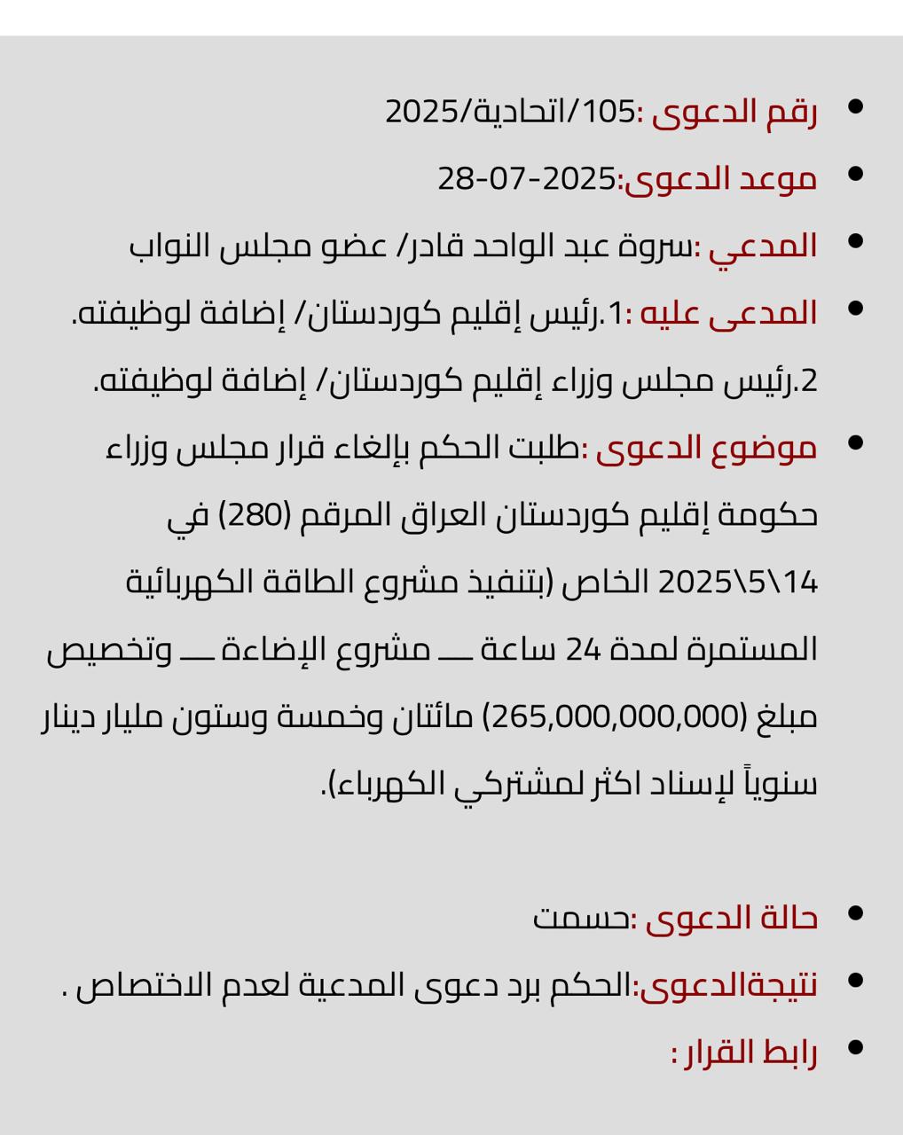 وأكدت المحكمة، أن النظر في هذه القضايا ليس من اختصاصها، كما رفضت المحكمة شكوى النائبة سروة عبد الواحد ضد مشروع الإنارة “روناكي”.