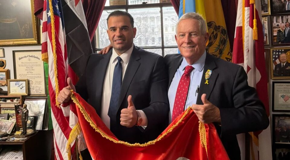 كما نشر النائب الأميركي جو ويلسون صورة جمعته بمبعوث الرئيس الأميركي، وهما يحملان العلم العراقي، فيما ظهر خلفهما العلم الأميركي، وإلى جانبهما العلم السوري الجديد.