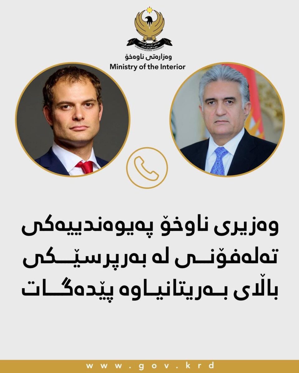 ڕۆژی پێنج شەممە ڕێکەوتی 11ـی کانوونی یەکەمی 2025، ڕێزدار ڕێبەر ئەحمەد، وەزیری ناوخۆی حکومەتی هەرێمی کوردستان پەیوەندییەکی تەلەفۆنی لە بەڕێز هامش فاڵکنەر – پەرلەمانتار و وەزیری دەوڵەت بۆ کاروباری رۆژهەڵاتی ناوەڕاست و باکووری ئەفریقیا پێگەیشت.
