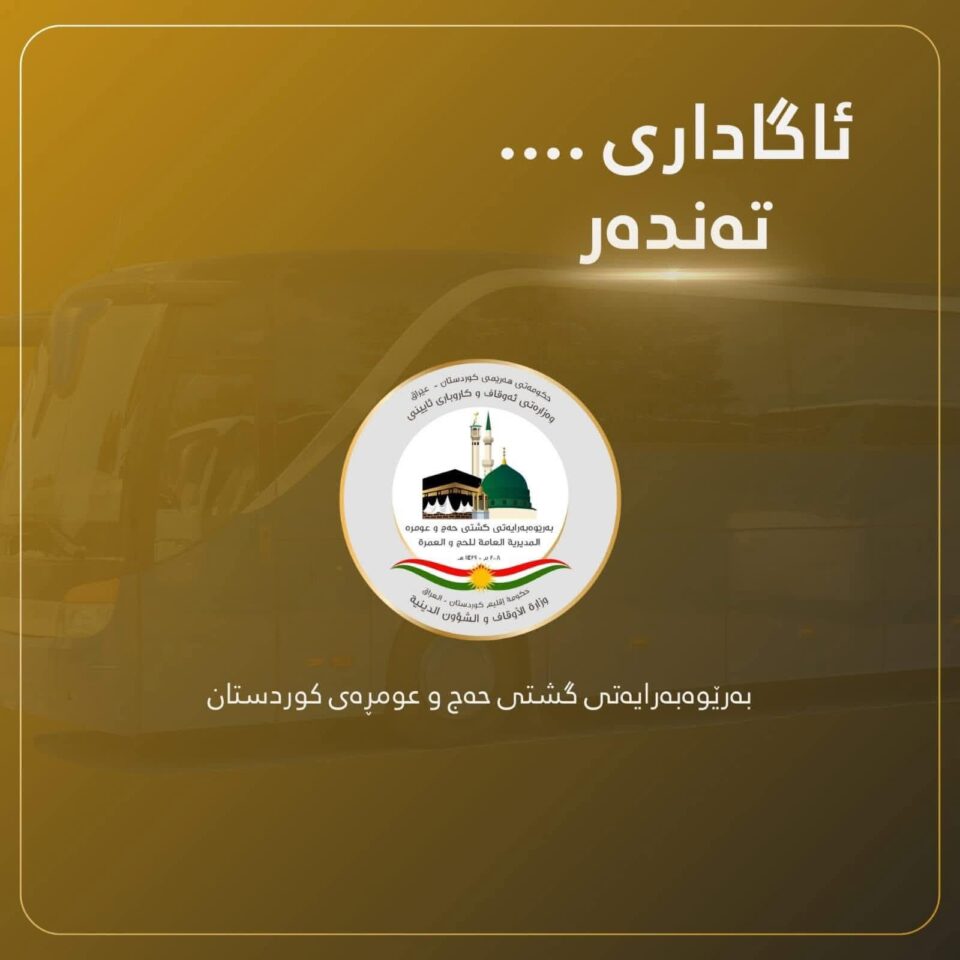 بهرێوهبهرایهتی گشتی حهج و عومڕهی ههرێمی كوردستان ئاگاداری سهرجهم كۆمپانیاكانی گواستنهوهی كهلوپهل له ههرێمی كوردستان دهكات ههر كۆمپانیایهك دهیهوێت بهشداربێت له كهمكردنهوهی هێنانهوهی كهلوپهلی حاجیان له عهرهبستانی سعوودیه له شاری مهككهی پیرۆزهوه بۆ ههرێمی كوردستان بۆ گشت پارێزگاكان و ئیداره سهربهخۆكان دهتوانن لە رۆژی چوارشهممه 7/1/2026 سهردانی بهشی یاسایی و گرێبهستهكان له بهرێوهبهرایهتی گشتی حهج و عومڕه بكهن به مهبهستی وهرگرتنی تهندهر دواكات بۆ وهرگرتن و گهڕانهوهی تهندهر كاتژمێر (11)ی پێش نیوهڕۆی رۆژی یهكشهممه بهرواری 18/1/2026 دهبێت.