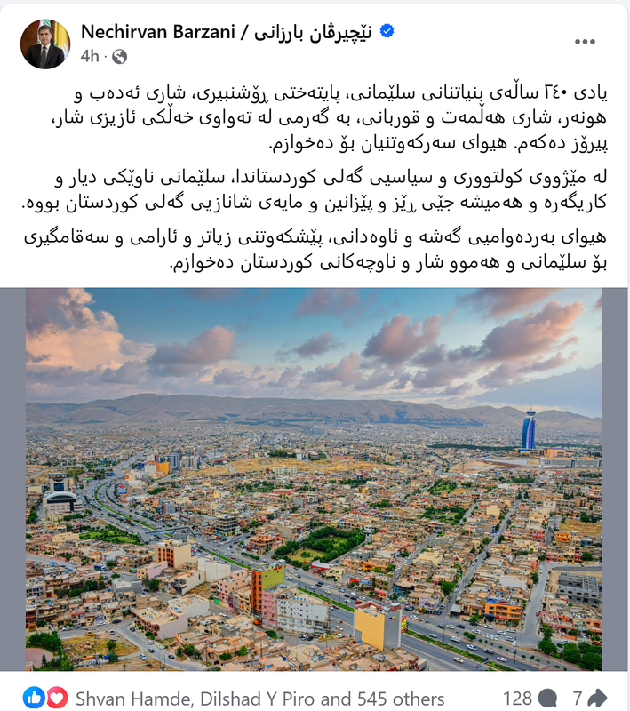 يادى ٢٤٠ ساڵهى بنياتنانى سلێمانى، پایتهختی ڕۆشنبيرى، شاری ئهدهب و هونهر، شارى ههڵمهت و قوربانى، به گهرمى له تهواوى خهڵكى ئازيزى شار، پيرۆز دهكهم. هيواى سهركهوتنيان بۆ دهخوازم.