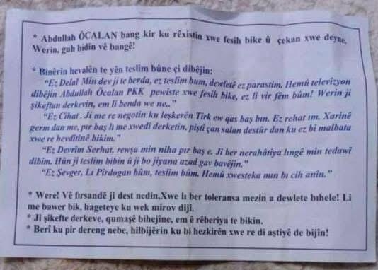 بە گوتەی شایەتحاڵان، ئەو نامەیە بە زمانی تورکی و کوردی تییدا نووسراوە و داوا لە ئەندامانی پەکەکە دەکەن گوێ لە بانگەوازی عەبدوڵڵا ئۆجەلان سەرکردە زیندانیکراوەکەیان بگرن، کە دەستبەرداری خەباتی چەکداری بن و چەکەکانیان دابنێن و خۆیان ڕادەستی دەسەڵاتدارانی تورکیا بکەن، هەروەها لە نامەکەدا ئاماژە بەوەش کراوە، حکومەت هاوکارییان دەکات ئەگەر وەڵامی ئەم بانگەوازە بدەنەوە.