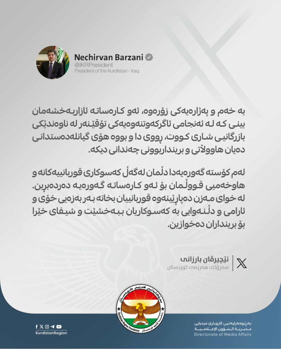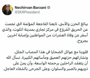 بە خەم و پەژارەیەکی زۆرەوە، ئەو کارەساتە ئازاربەخشەمان بينى کە لە ئەنجامی ئاگرکەوتنەوەیەکی تۆقێنەر لە ناوەندێکی بازرگانیی شاری کووت، ڕووی دا و بووە هۆی گيانلهدهستدانى دەیان هاووڵاتی و برینداربوونی چەندانی دیکە.