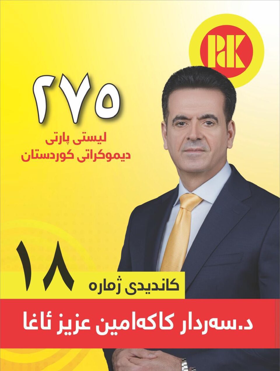 بەربژێری ژماره ١٨ی لیستی ٢٧٥ی پارتی دیموكراتی كوردستان له بازنهی سلێمانی، دهڵێت: “لە مێژووی شۆڕشی ئەیلوول و گوڵان و ڕاپەڕینەوە تاوەکوو شەڕی داعش و پارێزگاریکردن لە کورد و داستانەکانی ڕووبەڕووبوونەوەی گرووپە تائیفییەکانی لە پردێ و سحێلا، تاوەکوو هێرشە درۆنی و مووشەکییەکان، تا فریاگوزاریی ئاوی خێرای هەولێر و کارەبای ٢٤ کاتژمێری و شکاندنی گەمارۆی سەر مووچەی فەرمانبەرانی هەرێمی كوردستان، هەر پارتی بووە لە شەڕ و ئاشتیدا هەڵۆی پارێزگاریکردن و ئاوەدانی کوردستان بووە. لیستی ٢٧٥ی پارتی یارمەتیدەرە بۆ بەهێزکردنی قەوارەی هەرێمی كوردستان و ڕووبەڕووبوونەوەی هەموو ئەو مەترسییانەی کە دێنە بەردەم نەتەوەی کورد”.