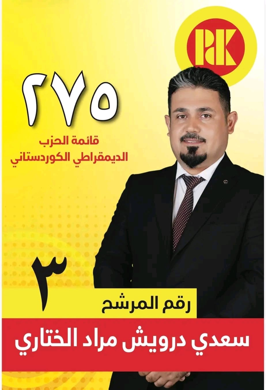 ​سەعدی دەروێش موراد ئەلخەتاری، بەربژێرێ هەژمارە (3) ل سەر لیستا (275) یا پارتی دیموکراتی کوردستان (پ.د.ک) بۆ پەرلەمانێ عیراقێ ل بازنەیا نەینەوا، راگەهاند کو ئارمانجا وی یا سەرەکی خزمەتکرنا “گەلێ مە یێ رێزدار” و داکۆکیکرن ل ماف و داخوازێن وان یێن رەوایە.