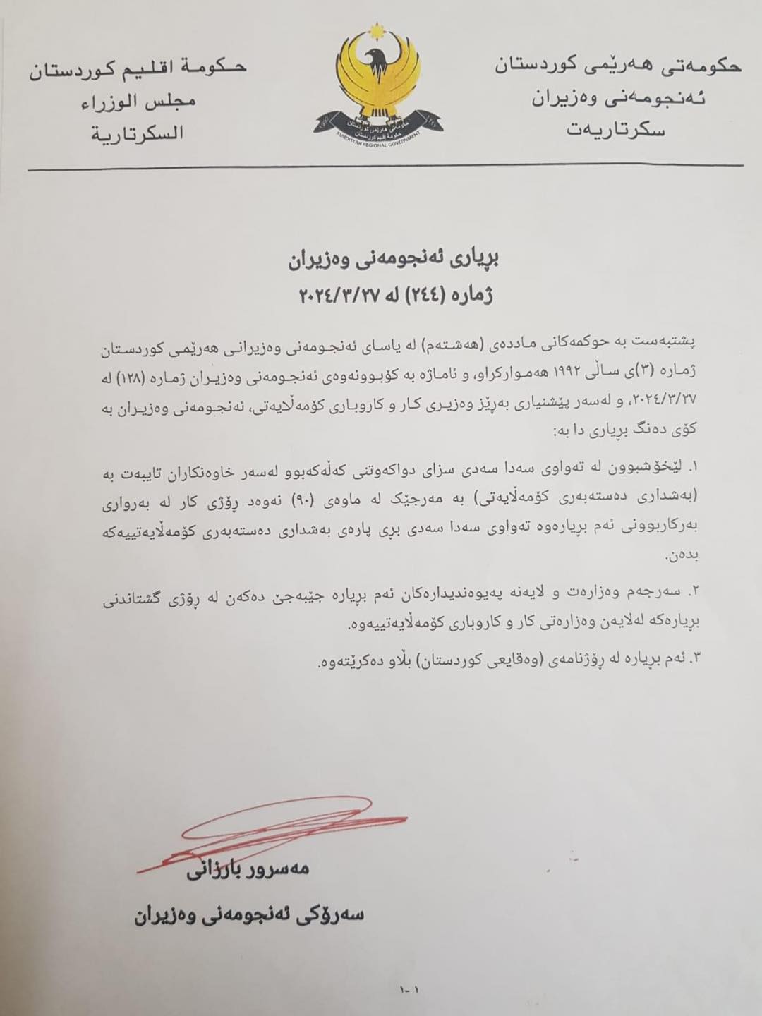 بڕیارەكە ئەمڕۆ یەكشەم بە فەرمی لەلایەن وەزارەتی كار و كاروباری كۆمەڵایەتی كەوتۆتە بواری جێبەجێكردنەوە، دوای ئەوەی بە واژووی مەسرور بارزانی سەرۆكی حكوومەت لە كۆبوونەوەی ئەنجوومەنی وەزیران لە رێكەوتی 27/3/2024 بڕیاری لەسەر درابوو.