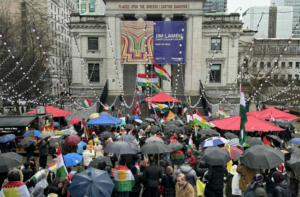كوردانی شاری (ڤانكووڤەر)ی كەنەدا، بە خۆپیشاندان و بەرزكردنەوەی ئاڵای كوردستان، پشتیوانیی سەرهەڵدانی ڕۆژهەڵاتی كوردستان و بەرخودانی ڕۆژئاوای كوردستان، دووپات كردەوە.