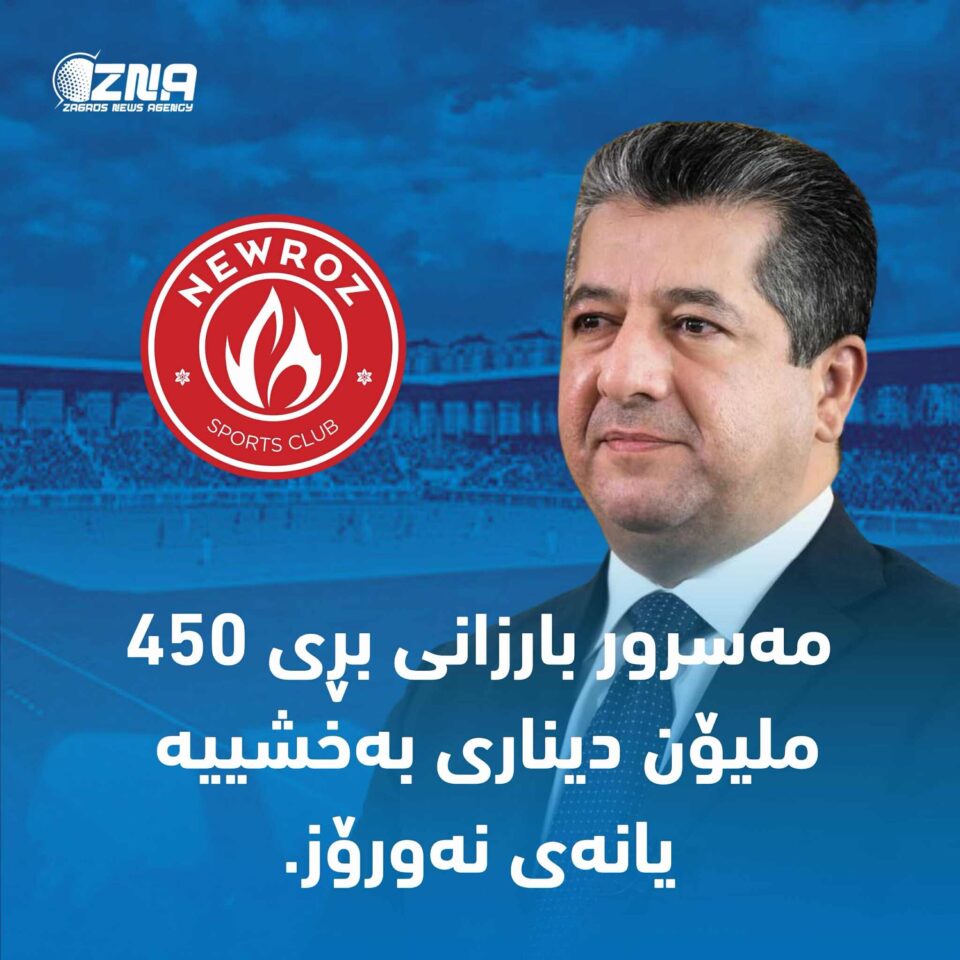 لە چەند مانگی ڕابردوودا یانەی وەرزشیی نەورۆز گیرۆدەی دۆخێکی نالەبار بوو، مەسرور بارزانی، سەرۆکی حکوومـەتی هەرێمی کوردستان، لە ڕێگەی نووسینگەکەیەوە بڕی ٤٥٠ ملیۆن دینار بە یانەی نەورۆز دەبەخشێت.