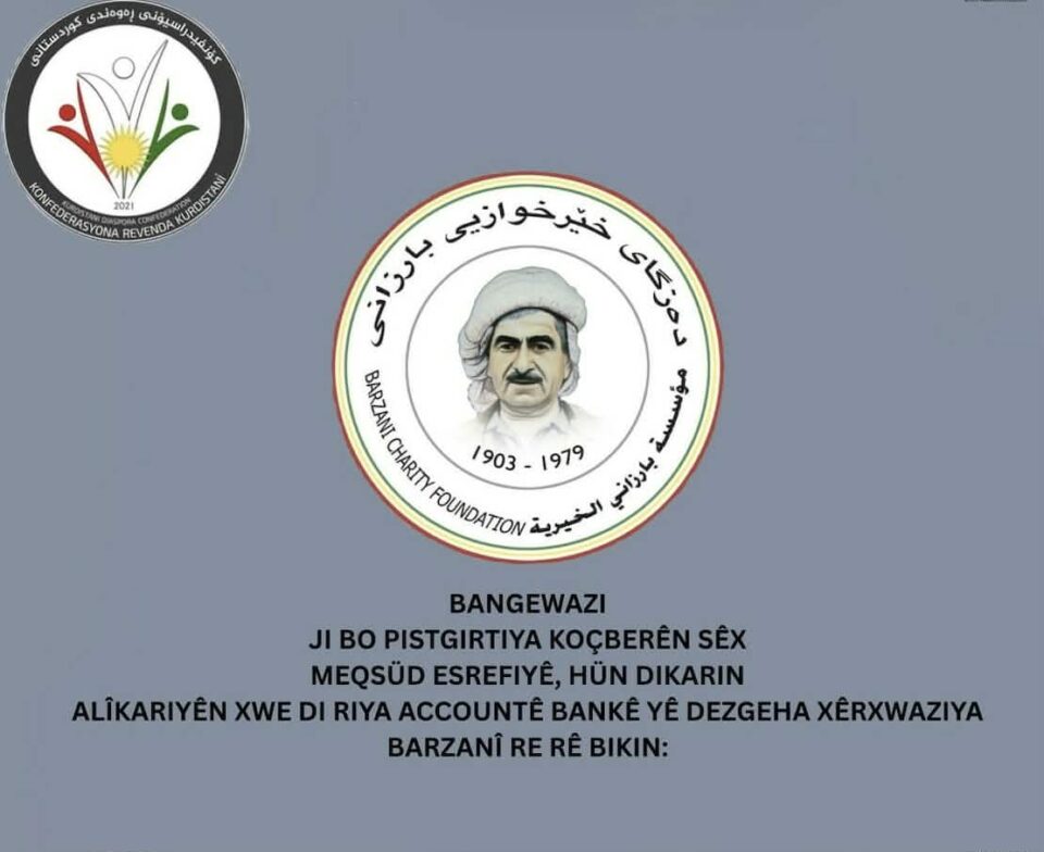 بۆ ئەم مەبەستە، کۆنفیدراسیۆنی ڕەوەندی کوردستانی چەند داواکارییەکی خستووەتە ڕوو:١. پشتیوانیکردنی دەزگای خێرخوازیی بارزانی لە ڕێگە فەرمییەکانەوە بۆ گەیاندنی هاوکارییەکان.٢. بڵاوکردنەوەی ژمارەی هەژمارە بانکییە پەسندکراوەکان لە میدیاکاندا بۆ کۆکردنەوەی کۆمەک.٣. گەیاندنی ئەم بانگەوازە بە هەموو ئەو کەس و لایەنانەی کە ئارەزووی بەشدارییان هەیە لەم ئەرکە مرۆییەدا.