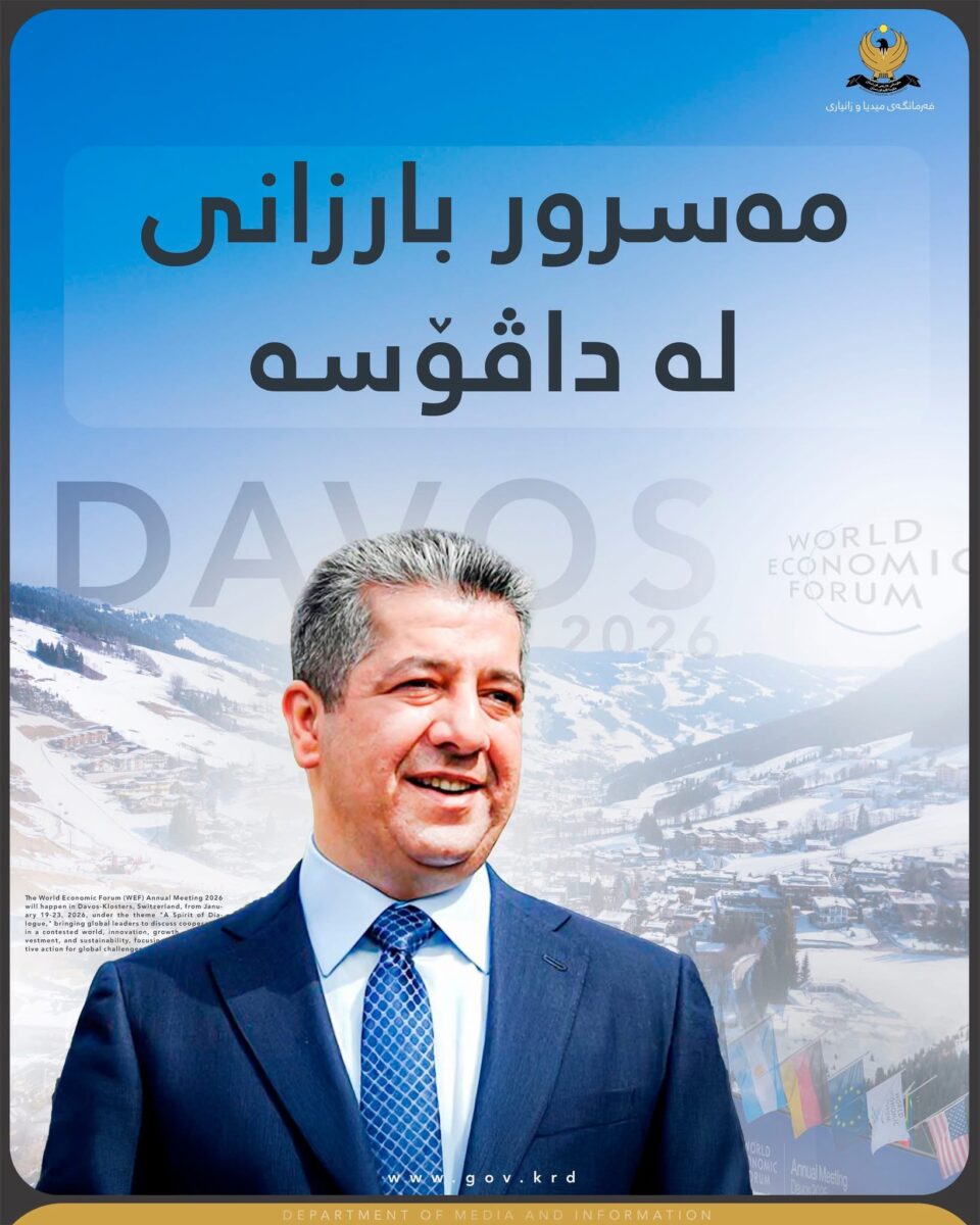 ئەمڕۆ دووشەممە 1/19، مەسرور بارزانی، سەرۆکی حکومەتی هەرێمی کوردستان، بەرەو سویسرا بەڕێ کەوت بۆ بەشداریکردن لە کۆڕبەندی ئابووریی جیهانیی داڤۆس کە ڕۆژانی 19 – 23/ 1 بەڕێوە دەچێت.