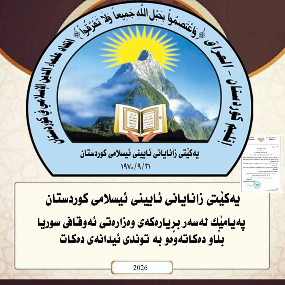بە نیگەرانیەکی قوڵەوە ئاگاداری رەوشی بارودۆخی کوردانی رۆژئاواین، کە وێڕای ئەو هەموو ستەم و هێڕش و داگیرکاری و شاربەدەرو تاوانانەی بەرامبەر بە هاوڵاتیانی کورد ئەنجام دەدرێت، وەزارەتی ئەوقافی سوریا گشتاندنێکی بڵاوکردۆتەوەو داوای قنوت و دوعا خوێندن لە سەرجەم پێشنوێژو وتارخوێنانی وڵاتەکەی دەکات بۆ سەرکەوتنی سوپای سوریا بەسەر هاوڵاتیانی کورد، لەگەڵ تەکبیر لێدان لە هەموو مزگەوتان وەک دەربڕێنی خۆشی بۆ سەرکەوتن و فەتحی کوردستانی رۆژئاوا.