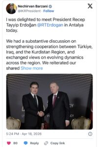 نێچیرڤان بارزانی، سەرۆکی هەرێمی کوردستان لە تویتێکدا لەبارەی کۆبوونەوەکەی لەگەڵ رەجەب تەیب ئەردۆغان، سەرۆککۆماری تورکیا نووسیویەتی، “خۆشحاڵ بووم کە ئەمڕۆ لە ئەنتاڵیا چاوم بە سەرۆک رەجەب تەیب ئەردۆغان کەوت.”