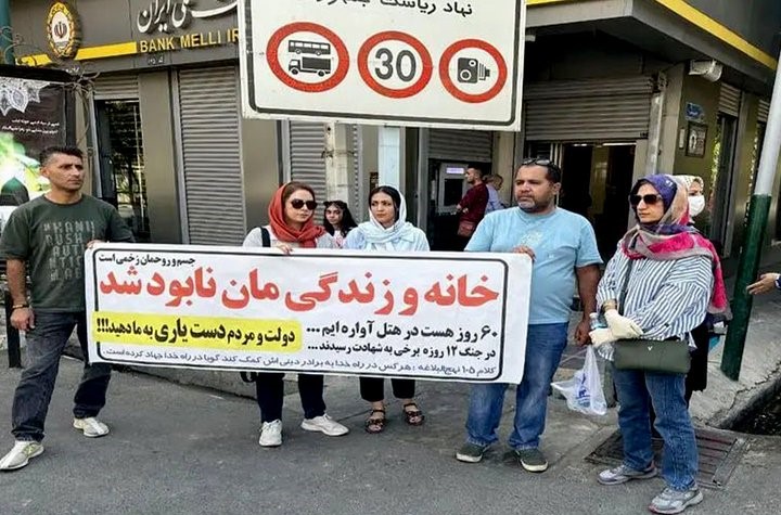 گرووپێک لەو هاووڵاتییە ئێرانییانەی لە “شەڕی ١٢ ڕۆژە”دا خانەکانیان لەدەست داوە، لەبەردەم باڵەخانەی سەرۆکایەتیی کۆمار گردبوونەوە، لە ناڕەزایەتی بەرانبەر فەرمانی چۆڵکردنی ئەو هۆتێلانەی تێیدا نیشتەجێ کرابوون و نادیاریی چارەنووسیان.